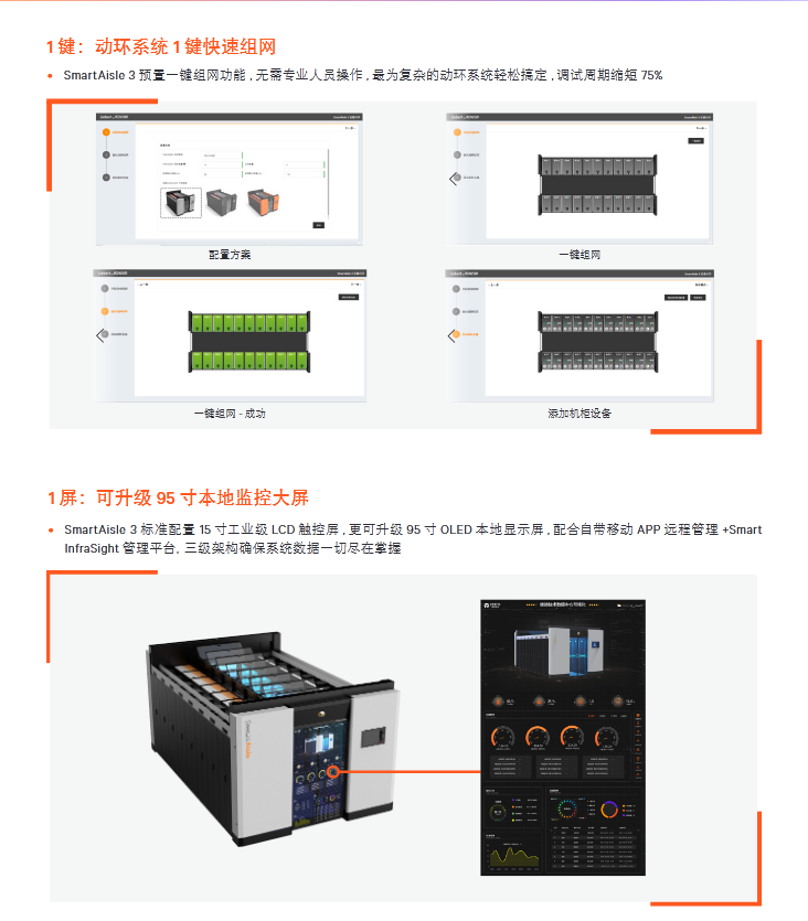 Vertiv™ SmartAisle™ 3 宏睿 模块化数据中心解决方案(简称Vertiv™ SmartAisle™ 3 宏睿)是维谛技术有限公司生产的数据中心解决方案产品,是一种以单机柜为最小颗粒度,配套列间空调,配套列间或外部UPS的高度集成,快速交付的模块化数据中心解决方案应用于中大型数据中心或机房等室内环境。Vertiv™ SmartAisle™ 3 宏睿用于存储符合行业标准(EIA-310-D)的19″机柜式硬件设备,包括服务器、语音、数据、Internet网络设备、机柜、封闭组件、供配电、制冷、监控设备等,可实现机柜内设备的承载、供电、制冷和监控,通过通道封闭提高该中大型数据中心的能源使用效率。
